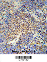 OTUD4 antibody (N-term) (Cat. APR05694G) immunohistochemistry analysis in formalin fixed and paraffin embedded human lung carcinoma followed by peroxidase conjugation of the secondary antibody and DAB staining. This data demonstrates the use of the OTUD4 antibody (N-term) for immunohistochemistry. Clinical relevance has not been evaluated. |