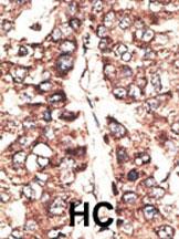 Formalin-fixed and paraffin-embedded human cancer tissue reacted with the primary antibody, which was peroxidase-conjugated to the secondary antibody, followed by DAB staining. This data demonstrates the use of this antibody for immunohistochemistry; clinical relevance has not been evaluated. BC = breast carcinoma; HC = hepatocarcinoma. |