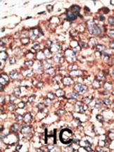 Formalin-fixed and paraffin-embedded human cancer tissue reacted with the primary antibody, which was peroxidase-conjugated to the secondary antibody, followed by DAB staining. This data demonstrates the use of this antibody for immunohistochemistry; clinical relevance has not been evaluated. BC = breast carcinoma; HC = hepatocarcinoma. |
