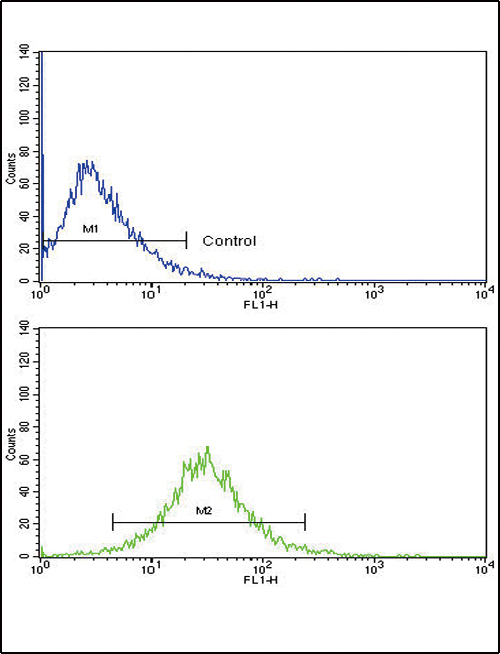 Flow cytometric analysis of HepG2 cells using MMP3 Antibody (Center)(bottom histogram) compared to a negative control cell (top histogram). FITC-conjugated goat-anti-rabbit secondary antibodies were used for the analysis. |