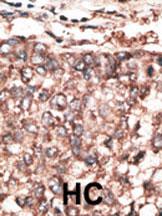 Formalin-fixed and paraffin-embedded human cancer tissue reacted with the primary antibody, which was peroxidase-conjugated to the secondary antibody, followed by AEC staining. This data demonstrates the use of this antibody for immunohistochemistry; clinical relevance has not been evaluated. BC = breast carcinoma; HC = hepatocarcinoma. |