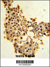 Formalin-fixed and paraffin-embedded human testis tissue with Cyclin E1 Antibody (C-term), which was peroxidase-conjugated to the secondary antibody, followed by DAB staining. This data demonstrates the use of this antibody for immunohistochemistry; clinical relevance has not been evaluated.