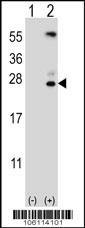 Western blot analysis of KLK6 (arrow) using rabbit polyclonal KLK6 Antibody (A13) (Cat. APR05744G). 293 cell lysates (2 ug/lane) either nontransfected (Lane 1) or transiently transfected (Lane 2) with the KLK6 gene.