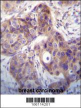 Kallikrein 6(KLK6) Antibody (N-term) (Cat. APR05744G)immunohistochemistry analysis in formalin fixed and paraffin embedded human breast carcinoma followed by peroxidase conjugation of the secondary antibody and DAB staining.This data demonstrates the use of Kallikrein 6(KLK6) Antibody (N-term) for immunohistochemistry. Clinical relevance has not been evaluated. |