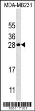 KLK7 Antibody (S82) (Cat. APR05745G) western blot analysis in MDA-MB231 cell line lysates (35ug/lane).This demonstrates the KLK7 antibody detected the KLK7 protein (arrow).