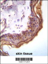 Kallikrein 7(KLK7) Antibody (Center) (Cat. APR05745G)immunohistochemistry analysis in formalin fixed and paraffin embedded human skin tissue followed by peroxidase conjugation of the secondary antibody and DAB staining.This data demonstrates the use of Kallikrein 7(KLK7) Antibody (Center) for immunohistochemistry. Clinical relevance has not been evaluated. |