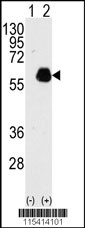 Western blot analysis of PXN(arrow) using rabbit polyclonal PXN Antibody (Y118) (Cat.APR05754G). 293 cell lysates (2 ug/lane) either nontransfected (Lane 1) or transiently transfected with PXN gene (Lane 2) (Origene Technologies).