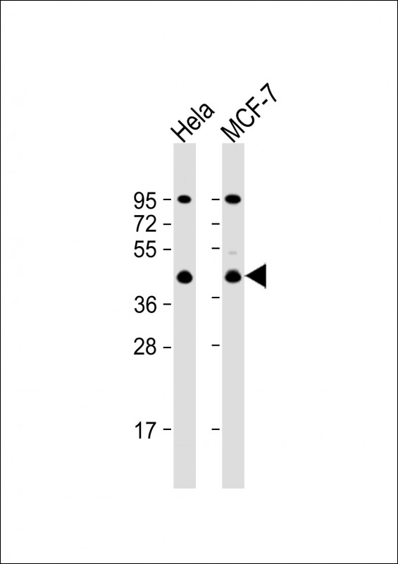 All lanes : Anti-ACTR2 Antibody (C-term) at 1:1000 dilution Lane 1: Hela whole cell lysate Lane 2: MCF-7 whole cell lysate Lysates/proteins at 20 μg per lane. Secondary Goat Anti-Rabbit IgG, (H+L), Peroxidase conjugated at 1/10000 dilution. Predicted band size : 45 kDa Blocking/Dilution buffer: 5% NFDM/TBST.