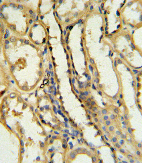 TRAP Antibody (N-term) (Cat. APR05766G) IHC analysis in formalin fixed and paraffin embedded human kidney tissue followed by peroxidase conjugation of the secondary antibody and DAB staining. This data demonstrates the use of the TRAP Antibody (N-term) for immunohistochemistry. Clinical relevance has not been evaluated. |