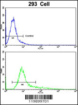 Flow cytometric analysis of 293 cells using TIEG2 Antibody (N-term)(bottom histogram) compared to a negative control cell (top histogram). FITC-conjugated goat-anti-rabbit secondary antibodies were used for the analysis. |