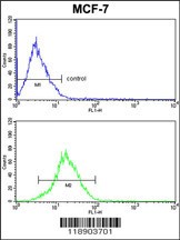 KRT13 Antibody (N-term) (Cat.APR05789G) FC analysis of MCF-7 cells (bottom histogram) compared to a negative control cell (top histogram). FITC-conjugated goat-anti-rabbit secondary antibodies were used for the analysis. |