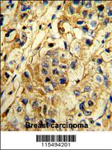 Formalin-fixed and paraffin-embedded human breast carcinoma reacted with TIMP1 Antibody (N-term), which was peroxidase-conjugated to the secondary antibody, followed by DAB staining. This data demonstrates the use of this antibody for immunohistochemistry; clinical relevance has not been evaluated.