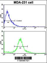 Flow cytometric analysis of MDA-231 cells using TIMP1 Antibody (N-term)(bottom histogram) compared to a negative control cell (top histogram). FITC-conjugated goat-anti-rabbit secondary antibodies were used for the analysis. |