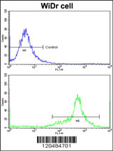 Flow cytometric analysis of widr cells using IGFBP6 Antibody (C-term)(bottom histogram) compared to a negative control cell (top histogram)FITC-conjugated goat-anti-rabbit secondary antibodies were used for the analysis. |
