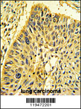 Formalin-fixed and paraffin-embedded human lung carcinoma with Calponin-1 Antibody (N-term), which was peroxidase-conjugated to the secondary antibody, followed by DAB staining. This data demonstrates the use of this antibody for immunohistochemistry; clinical relevance has not been evaluated. |
