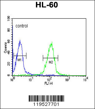 HLA-DRA Antibody (C-term) (Cat. APR05805G) flow cytometric analysis of HL-60 cells (right histogram) compared to a negative control cell (left histogram).FITC-conjugated goat-anti-rabbit secondary antibodies were used for the analysis. |