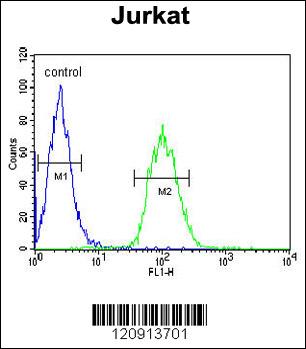 ALAD Antibody (C-term) (Cat. APR05809G) flow cytometric analysis of Jurkat cells (right histogram) compared to a negative control cell (left histogram).FITC-conjugated goat-anti-rabbit secondary antibodies were used for the analysis. |