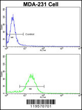Flow cytometric analysis of MDA-231 cells using COLEC11 Antibody (N-term)(bottom histogram) compared to a negative control cell (top histogram). FITC-conjugated goat-anti-rabbit secondary antibodies were used for the analysis. |
