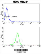 GAB2 Antibody (N-term) (Cat.APR05817G) flow cytometry analysis of MDA-MB231 cells (bottom histogram) compared to a negative control cell (top histogram). FITC-conjugated goat-anti-rabbit secondary antibodies were used for the analysis. |
