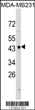 Western blot analysis of NDRG1 Antibody (N-term) (Cat. APR05823G) in MDA-MB231 cell line lysates (35ug/lane). NDRG1 (arrow) was detected using the purified Pab.