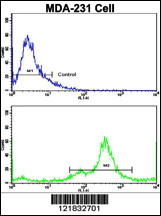 Flow cytometric analysis of MDA-231 cells using NDRG1 Antibody (N-term)(bottom histogram) compared to a negative control cell (top histogram). FITC-conjugated goat-anti-rabbit secondary antibodies were used for the analysis. |