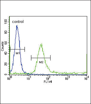 IGFBP4 Antibody (N-term) (Cat. APR05826G) flow cytometric analysis of WiDr cells (right histogram) compared to a negative control cell (left histogram).FITC-conjugated goat-anti-rabbit secondary antibodies were used for the analysis. |