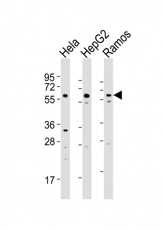 All lanes : Anti-GRK5 Antibody (N574) at 1:2000 dilution Lane 1: Hela whole cell lysates Lane 2: HepG2 whole cell lysates Lane 3: Ramos whole cell lysates Lysates/proteins at 20 μg per lane. Secondary Goat Anti-Rabbit IgG, (H+L), Peroxidase conjugated at 1/10000 dilution Predicted band size : 68 kDa Blocking/Dilution buffer: 5% NFDM/TBST.