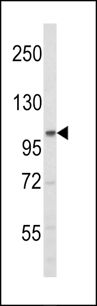 Western blot analysis of ERN2 N-term (Cat. APR05846G) in mouse stomach tissue lysates (35ug/lane). ERN2 (arrow) was detected using the purified Pab. |