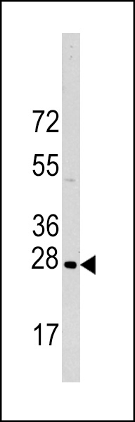 Western blot analysis of HSPB1 Antibody (S83) (Cat.APR05850G) in Hela cell line lysates (35ug/lane). HSPB1 (arrow) was detected using the purified Pab.