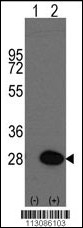 Western blot analysis of HSPB1(arrow) using rabbit polyclonal HSPB1 Antibody (S83) (Cat.APR05850G). 293 cell lysates (2 ug/lane) either nontransfected (Lane 1) or transiently transfected with the HSPB1 gene (Lane 2) (Origene Technologies). |