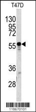 Western blot analysis of A1BG antibody (C-term) (Cat.APR05884G) in T47D cell line lysates (35ug/lane). A1BG (arrow) was detected using the purified Pab.