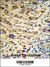 A1BG Antibody (C-term) (RB18670) IHC analysis in formalin fixed and paraffin embedded human breast carcinoma tissue followed by peroxidase conjugation of the secondary antibody and DAB staining. This data demonstrates the use of the A1BG Antibody (C-term) for immunohistochemistry. Clinical relevance has not been evaluated. |