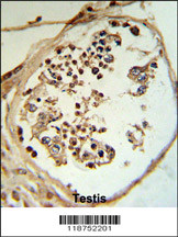 LYAR Antibody (N-term) (RB18752) IHC analysis in formalin fixed and paraffin embedded human testis tissue followed by peroxidase conjugation of the secondary antibody and DAB staining. This data demonstrates the use of the LYAR Antibody (N-term) for immunohistochemistry. Clinical relevance has not been evaluated. |