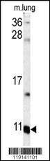 Western blot analysis of S100A6 antibody (C-term) (Cat.APR05894G) in mouse lung tissue lysates (35ug/lane). S100A6 (arrow) was detected using the purified Pab.
