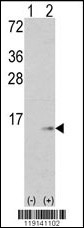 Western blot analysis of S100A6 (arrow) using rabbit polyclonal S100A6 Antibody (C-term) (Cat. APR05894G).293 cell lysates (2 ug/lane) either nontransfected (Lane 1) or transiently transfected with the S100A6 gene (Lane 2) (Origene Technologies).