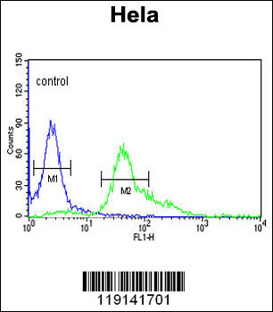 S100A6 Antibody (C-term) (Cat. APR05894G) flow cytometric analysis of Hela cells (right histogram) compared to a negative control cell (left histogram).FITC-conjugated goat-anti-rabbit secondary antibodies were used for the analysis. |