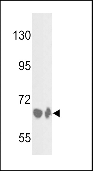 Western blot analysis of BF Antibody (Center) (Cat. APR05896G) in HepG2 cell line and mouse liver tissue lysates (35ug/lane). BF (arrow) was detected using the purified Pab.