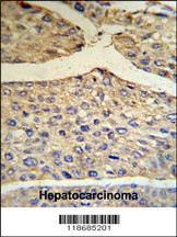 BF Antibody (Center) (RB18685) IHC analysis in formalin fixed and paraffin embedded human hepatocarcinoma tissue followed by peroxidase conjugation of the secondary antibody and DAB staining. This data demonstrates the use of the BF Antibody (Center) for immunohistochemistry. Clinical relevance has not been evaluated. |