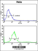 TECPR1 Antibody (C-term) (Cat. APR05902G) flow cytometric analysis of Hela cells (bottom histogram) compared to a negative control cell (top histogram).FITC-conjugated goat-anti-rabbit secondary antibodies were used for the analysis. |