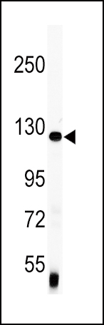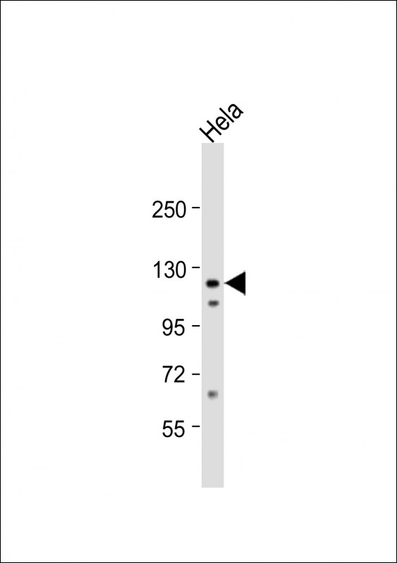 Anti-VINC Antibody (C-term) at 1:1000 dilution + Hela whole cell lysate Lysates/proteins at 20 μg per lane. Secondary Goat Anti-Rabbit IgG, (H+L), Peroxidase conjugated at 1/10000 dilution. Predicted band size : 124 kDa Blocking/Dilution buffer: 5% NFDM/TBST.