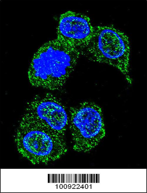 Confocal immunofluorescent analysis of MAPK8 Antibody (C-term)( APR05917G) with HepG2 cell followed by Alexa Fluor 488-conjugated goat anti-rabbit lgG (green).DAPI was used to stain the cell nuclear (blue).