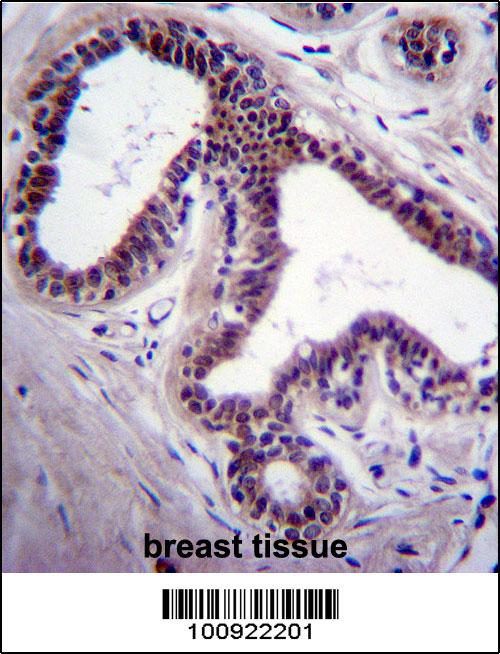 MAPK8 Antibody (C-term) (Cat. APR05917G)immunohistochemistry analysis in formalin fixed and paraffin embedded human breast tissue followed by peroxidase conjugation of the secondary antibody and DAB staining.This data demonstrates the use of MAPK8 Antibody (C-term) for immunohistochemistry. Clinical relevance has not been evaluated. |