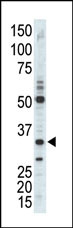 Western blot analysis of anti-CDK1 Pab (Cat. APR05921G) in A375 cell lysate. CDK1 (arrow) was detected using purified Pab. Secondary HRP-anti-rabbit was used for signal visualization with chemiluminescence. |