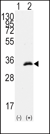 Western blot analysis of CDK1(arrow) using rabbit polyclonal CDK1 Antibody (T14) (Cat.APR05922G). 293 cell lysates (2 ug/lane) either nontransfected (Lane 1) or transiently transfected with the CDK1 gene (Lane 2) (Origene Technologies).