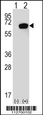 Western blot analysis of HSPA1A (arrow) using rabbit polyclonal HSPA1A Antibody (S41) (Cat.APR05936G). 293 cell lysates (2 ug/lane) either nontransfected (Lane 1) or transiently transfected with the HSPA1A gene (Lane 2) (Origene Technologies). |
