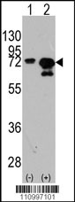 Western blot analysis of HSPA1A (arrow) using rabbit polyclonal HSPA1A Antibody (Y525) (Cat.APR05937G). 293 cell lysates (2 ug/lane) either nontransfected (Lane 1) or transiently transfected with the HSPA1A gene (Lane 2) (Origene Technologies). |