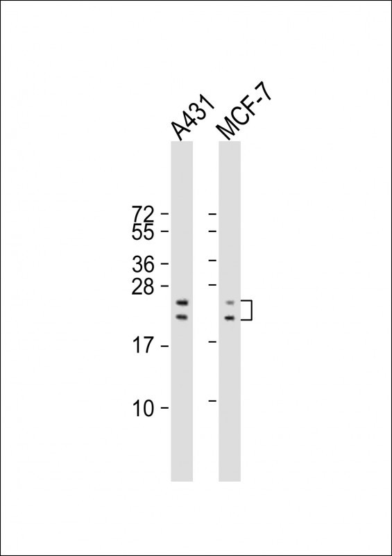 All lanes : Anti-RAC1 Antibody (S71) at 1:2000 dilution Lane 1: A431 whole cell lysate Lane 2: MCF-7 whole cell lysate Lysates/proteins at 20 μg per lane. Secondary Goat Anti-Rabbit IgG, (H+L), Peroxidase conjugated at 1/10000 dilution. Predicted band size : 21 kDa Blocking/Dilution buffer: 5% NFDM/TBST.