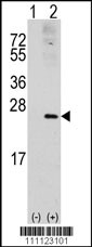 Western blot analysis of RAC1 (arrow) using rabbit polyclonal RAC1 Antibody (S71) (Cat.APR05940G).293 cell lysates (2 ug/lane) either nontransfected (Lane 1) or transiently transfected with the RAC1 gene (Lane 2) (Origene Technologies). |