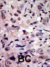 Formalin-fixed and paraffin-embedded human cancer tissue reacted with the primary antibody, which was peroxidase-conjugated to the secondary antibody, followed by AEC staining. This data demonstrates the use of this antibody for immunohistochemistry; clinical relevance has not been evaluated. BC = breast carcinoma; HC = hepatocarcinoma. |