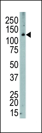 Western blot analysis of anti-CSF1R Pab (Cat. APR05949G) in human placenta. CSF1R (arrow) was detected using purified Pab. Secondary HRP-anti-rabbit was used for signal visualization with chemiluminescence.